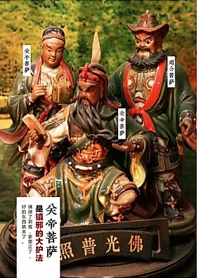 答:不是三位关帝菩萨,关帝菩萨旁边的一位 叫周仓菩萨,是当时关帝菩萨的助手;还有一位是关 帝菩萨的孩子,叫关平。关平菩萨、关帝菩萨、周仓 菩萨(明白了,那我们可不可以拍下来,然后也供奉 起来?)当然可以,这是个整体,现在都是护法、大 护法,供三尊非常好。